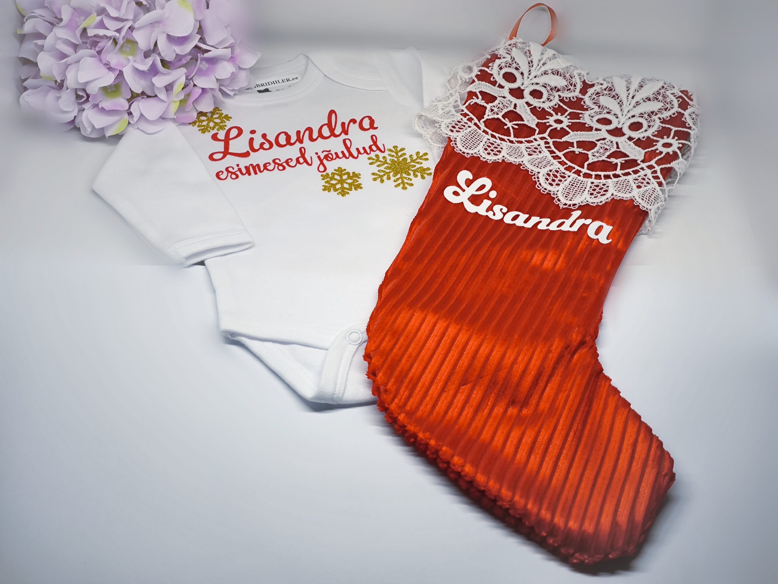 • Lumehelbed on kuldsest glitterist ning nimi punasest sametist.